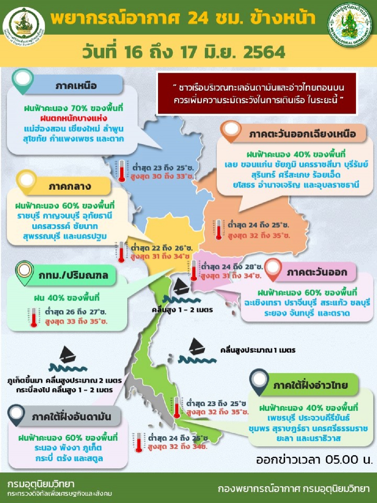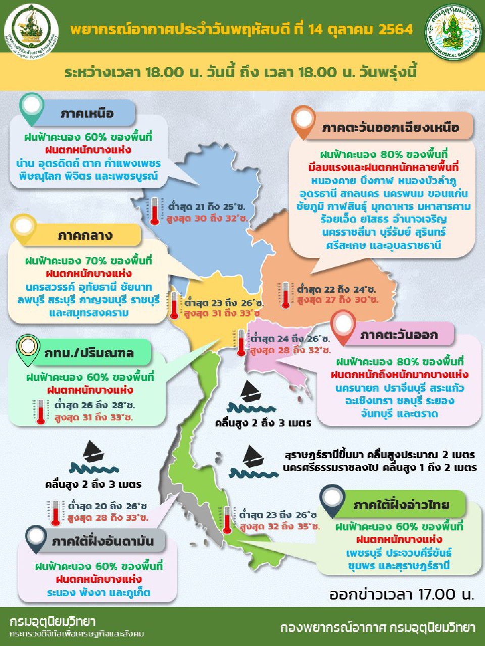 ระยอง สภาพอากาศ พรงนจนทร 13 กนยายน 2564. ภาคเหนอ มฝนฟาคะนองรอยละ 60 ของพนท และมฝนตกหนก. พยากรณอากาศวนพรงน สำหรบประเทศไทยตงแตเวลา 1700 วนน ถง 1700 วนพรงน.